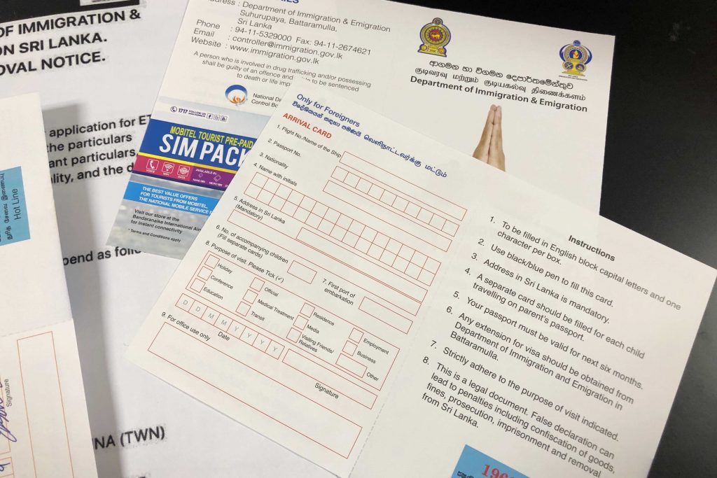 由於中華民國護照是不被斯里蘭卡承,所以過海關前,必須要拿到『簽證用途身分聲明書』請準備:有效護照/來回機票/2寸大頭照/電子簽證/入境單