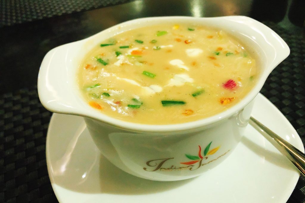 湯品的部分口味偏鹹,喝起來像是濃郁的玉米湯,值得讚賞的是湯里加入豐富的蔬菜和雞肉,且溫度夠燙口!