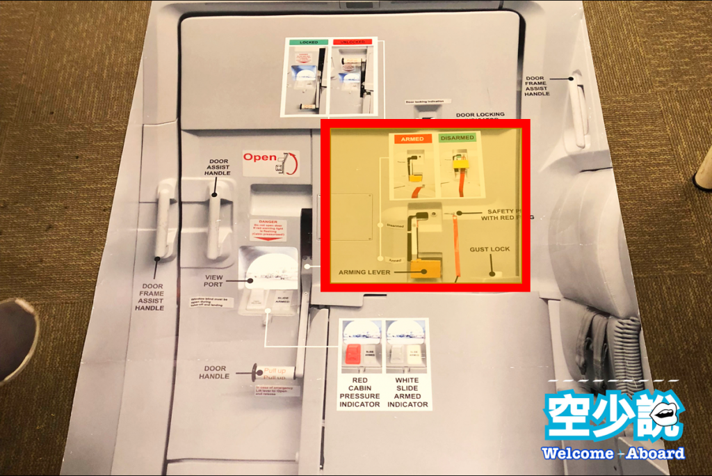 - 紅色(Armed):一旦遇到緊急狀況須打開艙門時,逃生梯就會自動充氣彈出,此時艙門處於『待命模式』