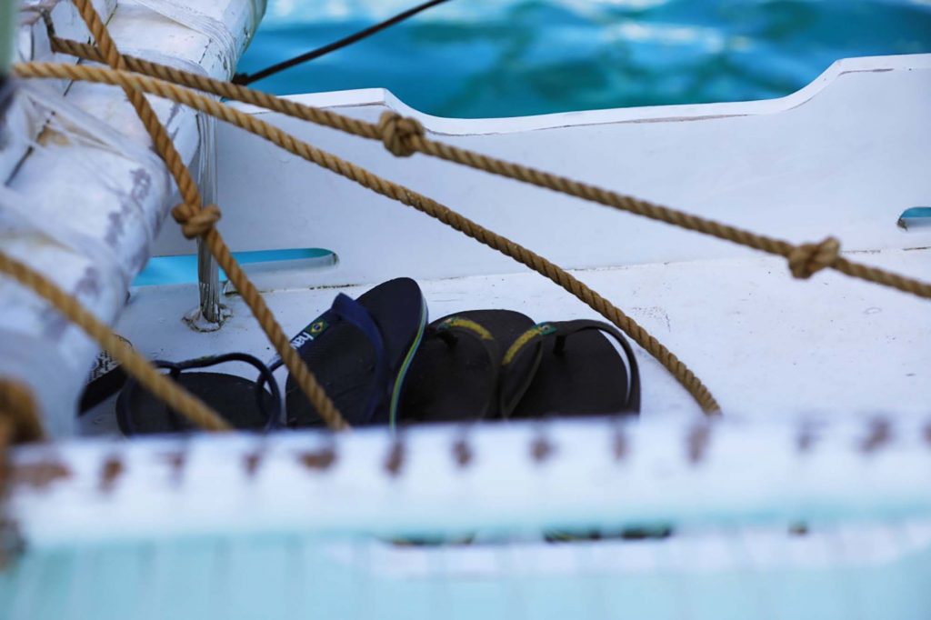 上船前是需要脫鞋子的,並放在帆船中央的凹槽裡,怕在航行過程中,因浪花產生的顛頗或是濺起的水花,而使拖鞋掉入海中,一去不復返。