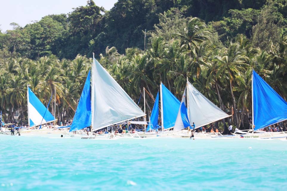 從外海向長灘島內看,可以看到連綿7公里的白沙灘,前方還有多隻藍白相間的風帆船隻(通常帆布上都是中國品牌的廣告),在航行過程中,不時也會與跳島行程的接駁船差身而過!